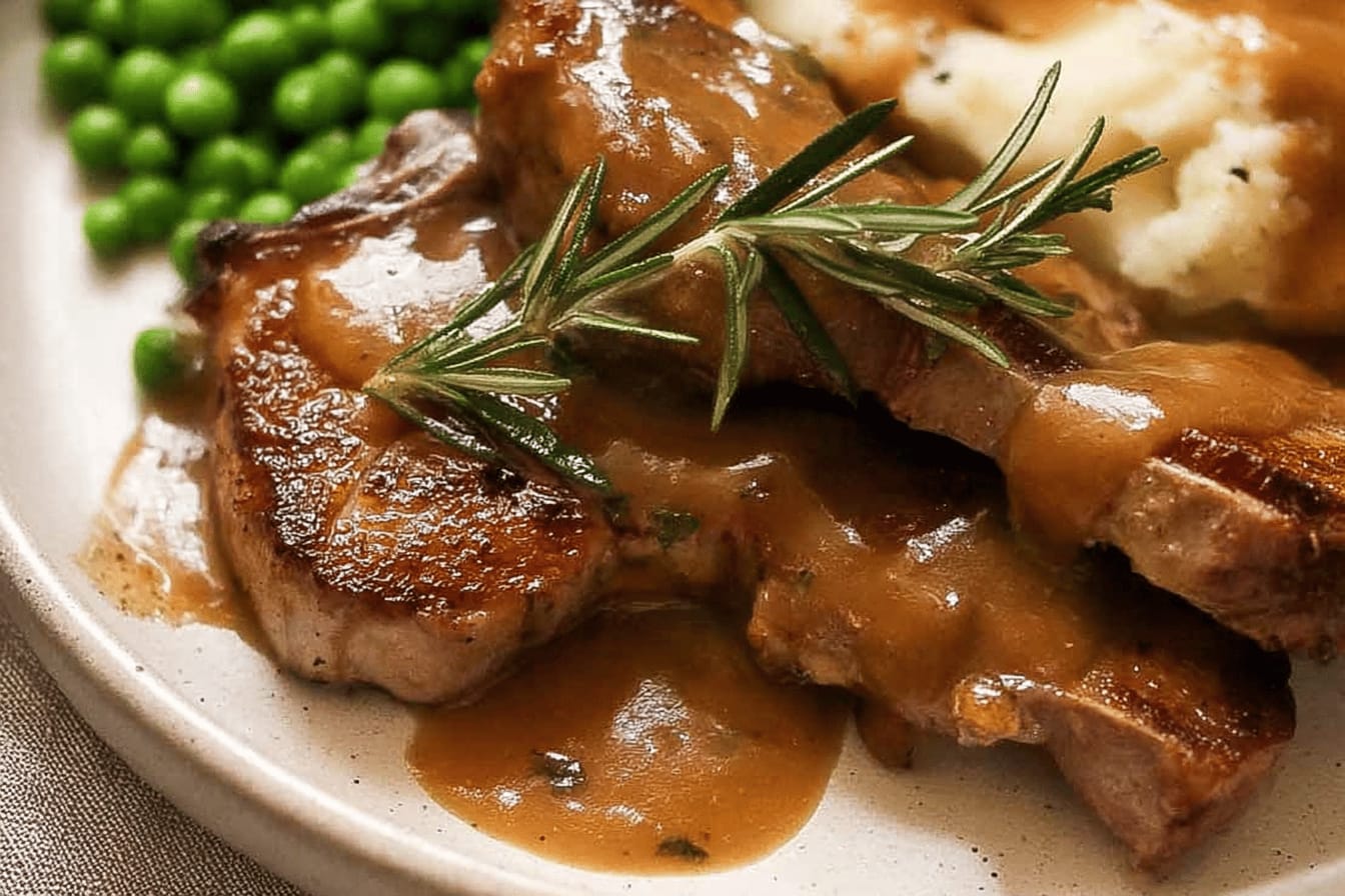Serve the lamb chops with the rosemary gravy poured over them. Accompany with creamy mashed potatoes and a side of peas for a complete meal.